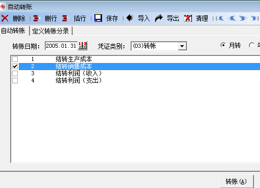 在結轉銷售成本前打上勾,然后點擊轉賬,軟件就會自動生成相應的主營業務成本的記賬憑證,實現結轉銷售成本了。操作界面如下圖: