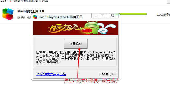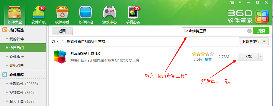 可以用360軟件管家來修復更新Flash,操作步驟如下: