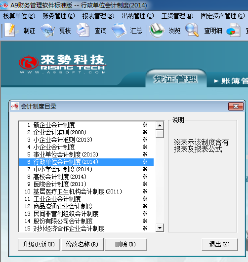 為方便廣大用戶能及時(shí)用上最新的行政單位會計(jì)制度,A9財(cái)務(wù)管理軟件于2013年底,將該制度的科目,報(bào)表設(shè)計(jì)進(jìn)軟件中,如圖: